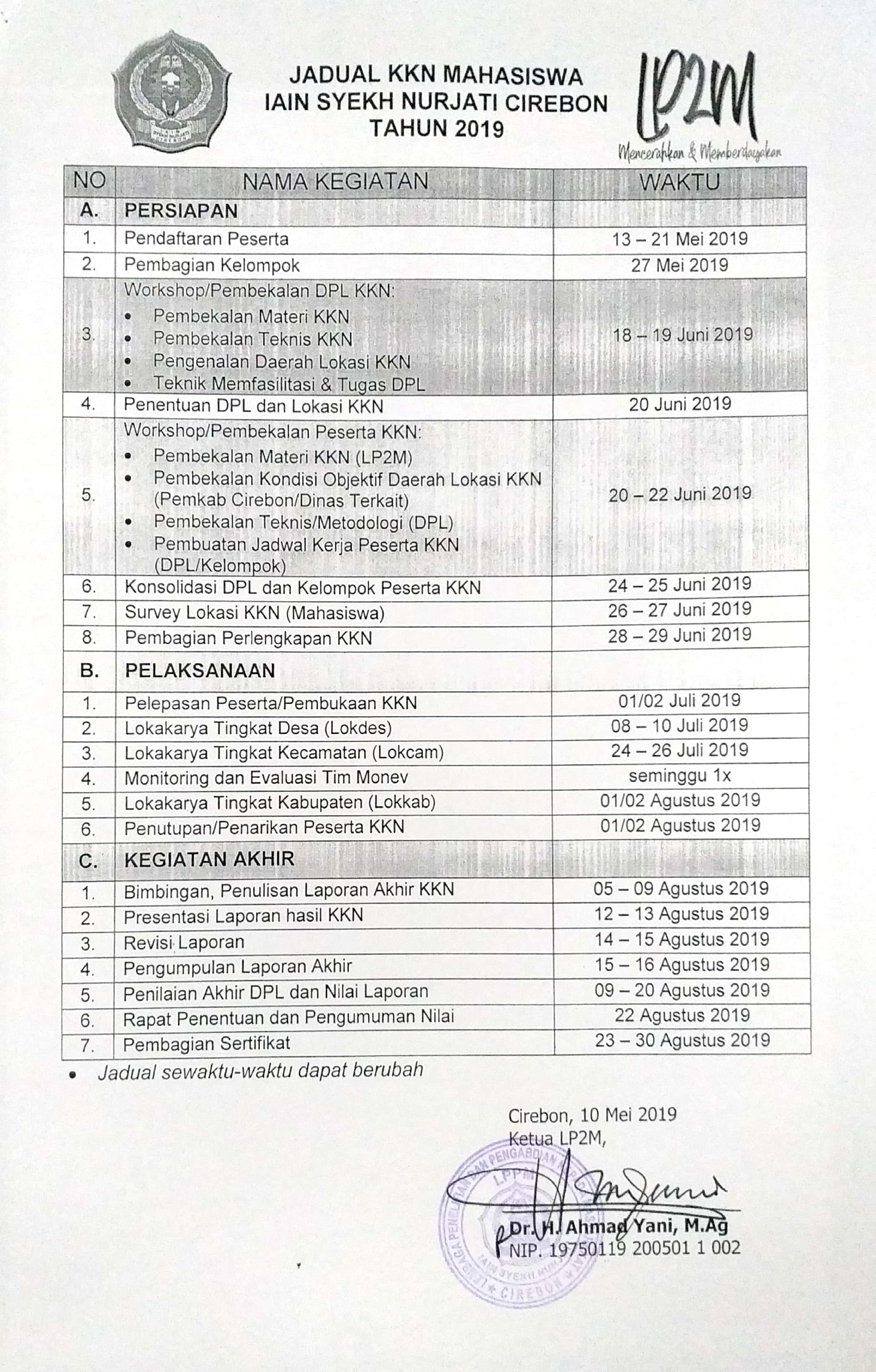 Berikut adalah jadwal KKN Mahasiswa IAIN Sekh Nurjati Tahun 2019